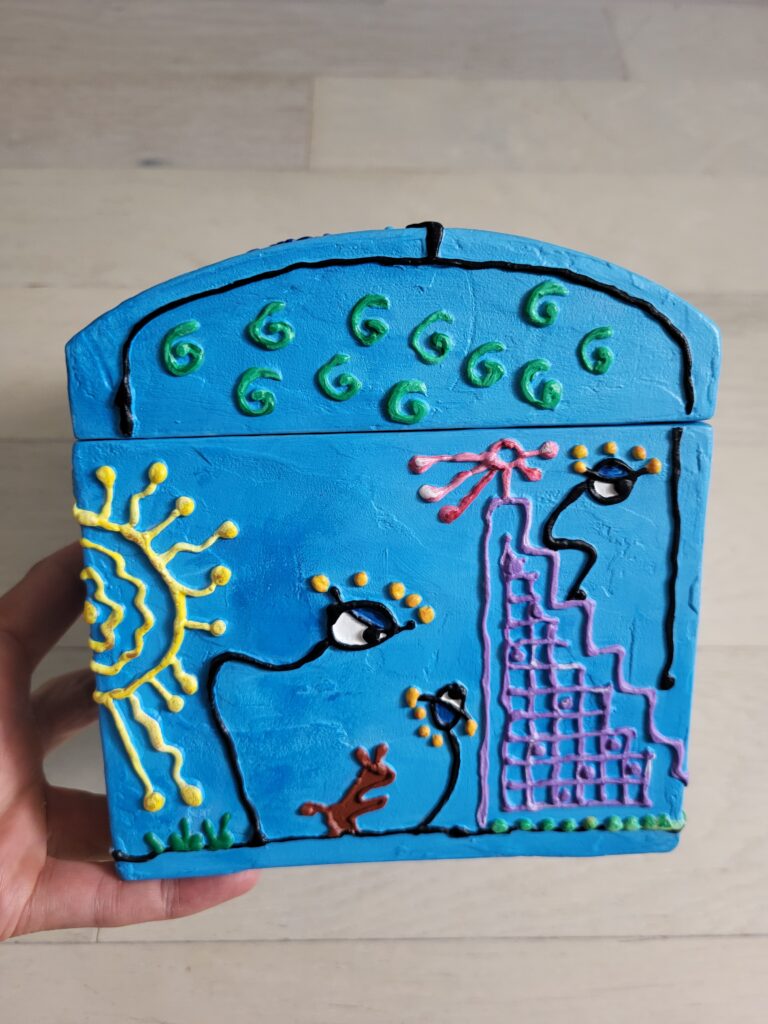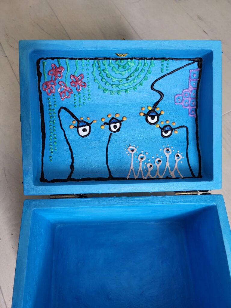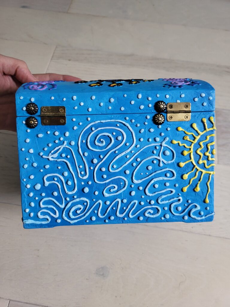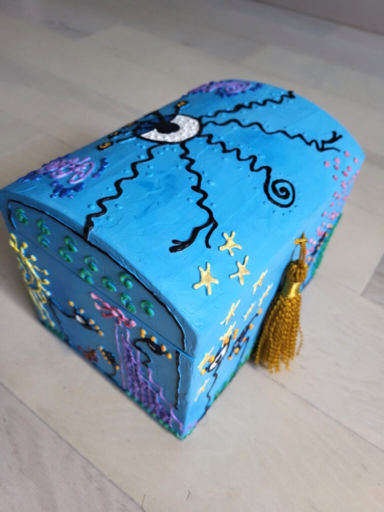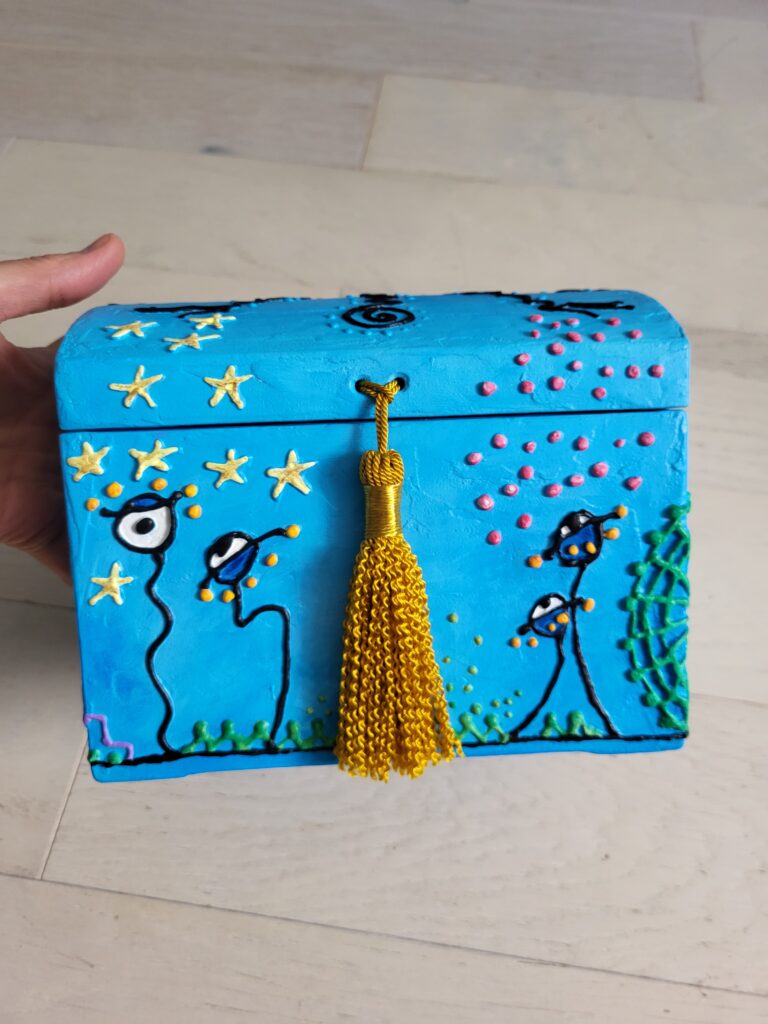 Boites en bois, couvercle à charnières, peinture pigments bleu outremer, dessins gravés peints en or, pompon doré